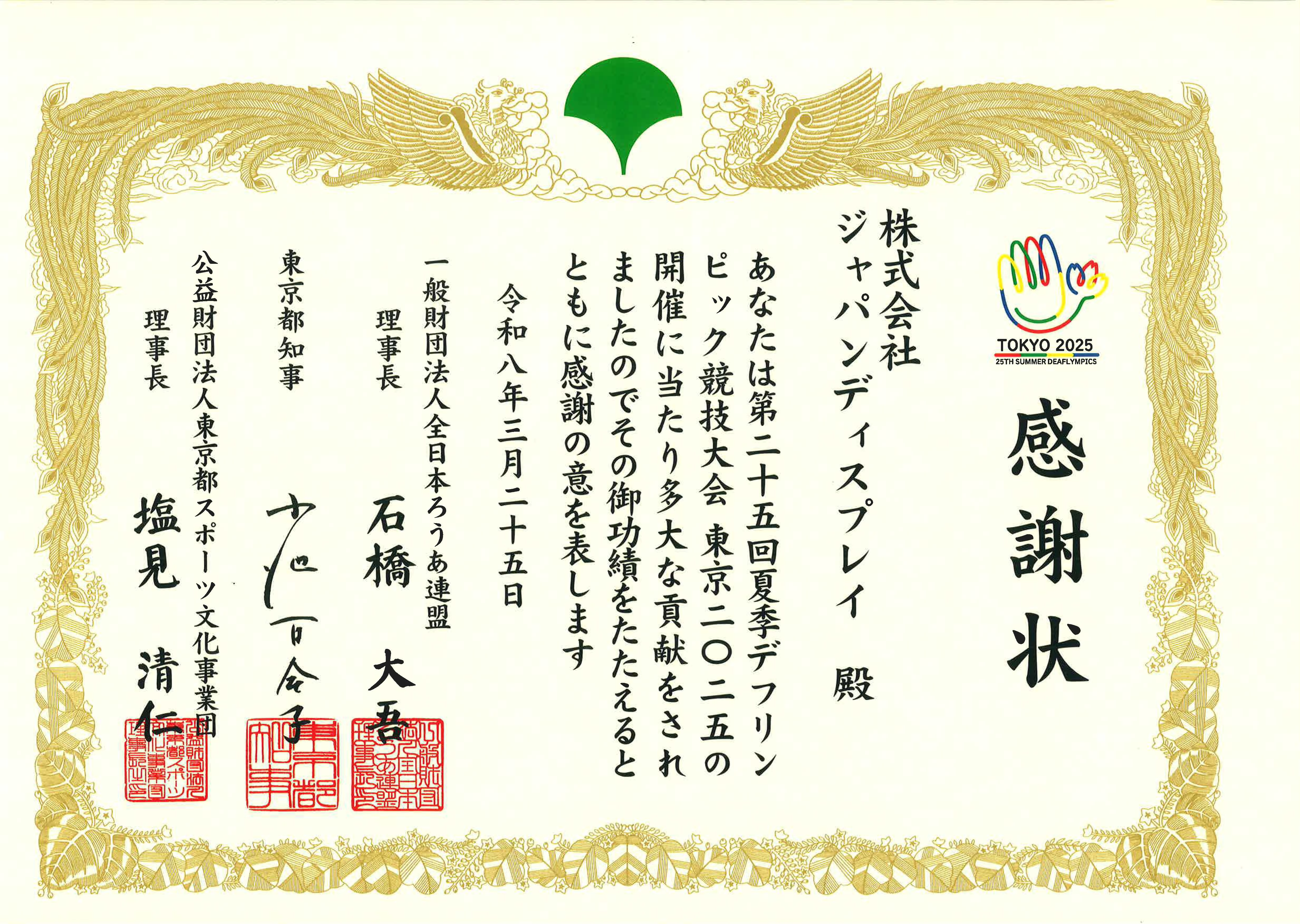 At the 25th Summer Deaflympics Tokyo 2025, held in November, JDI participated as a Total Support Member. As part of our support for the preparation and operation of the event,JDI lent 12-inch and 21-inch models of the transparent interface. In recognition of these efforts, JDI received a certificate of appreciation from those involved in the organization of the Games. We sincerely appreciate the positive evaluation of our contribution and are deeply grateful for this acknowledgment.